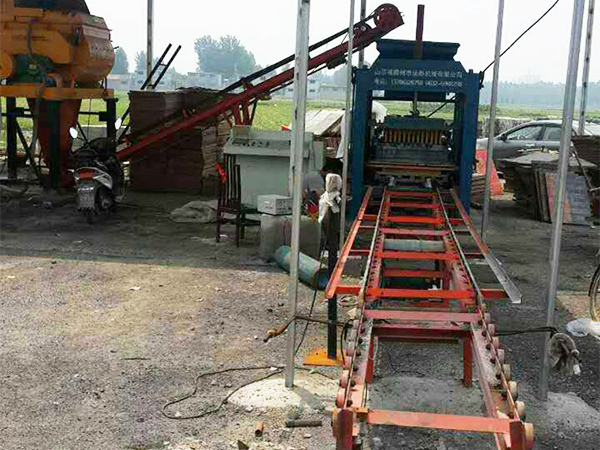 將原料按比例倒在攪拌機(jī)斗內(nèi),攪拌機(jī)自動上料到攪拌倉內(nèi),經(jīng)強(qiáng)制攪拌均勻后經(jīng)輸送機(jī)送到磚機(jī)出料斗上,經(jīng)喂料小車送到底模上,上振下壓后成型,成品由液壓缸送到拉板車上。